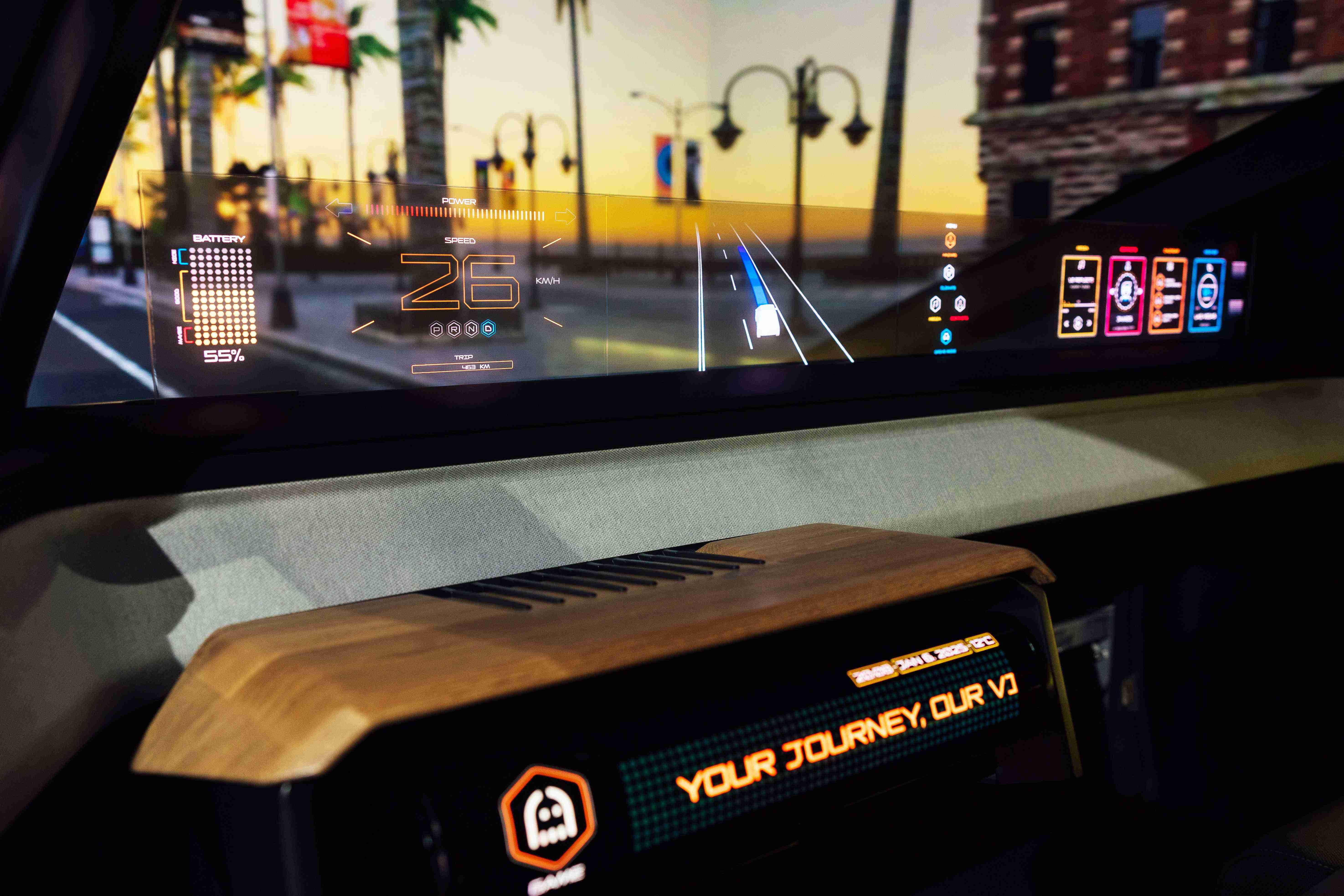 彩霸王Smart Cockpit 2025 在车头及车尾搭载合作伙伴Ennostar开发的互动式矩阵显示器(Interactive Matrix Display),,,,其突破传设计框架,,,,利用优化的光源整合技术,,提供更高亮度与对比度的显示效果,,,,营造驾车者个性化风格并传递讯息。。