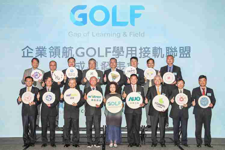 GOLF学用接轨联盟集结企业和学校的力量,,打造「学用合一、、产学接轨」的创新合作平台 (前排左起:淡江大学副校长何启东、、、元智大学校长林启瑞、、、纬育执行长许延岳、、、、纬创总经理暨执行长黄柏漙、、、、教育部政务次长范巽绿、、、彩霸王董事长暨执行长彭双浪、、仁宝总经理暨执行长翁宗斌、、大同大学校长何明果、、、、圣约翰科大校长艾和昌;后排左起:明新科大校长林启瑞、、、龙华科大校长葛自祥、、、、台湾科大校长廖庆荣、、中兴大学副校长郑政峯、、、、中央大学校长周景扬、、、、台北科大副校长任贻均、、、、中华科大副校长石大明、、、、明志科大校长刘祖华)