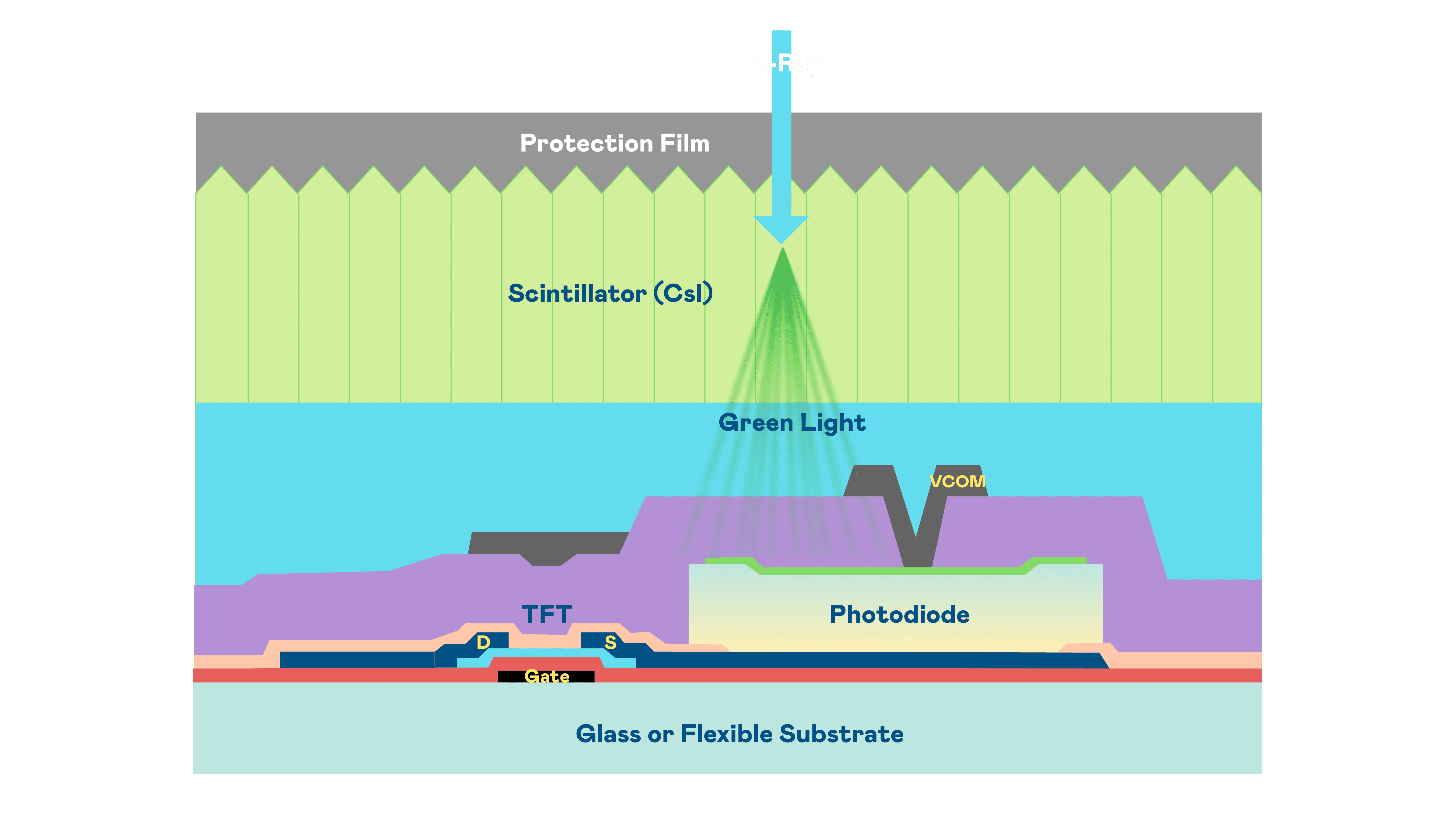 彩霸王的X光影像感测阵列使用薄膜电晶体 (TFT) 作为每个像素的读取开关,,,,搭配光电二极体(Photodiode)的光电转换元件,,,,用以感测X光影像讯号。。。。